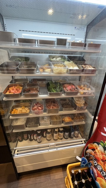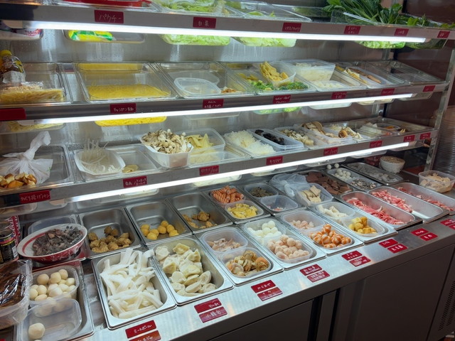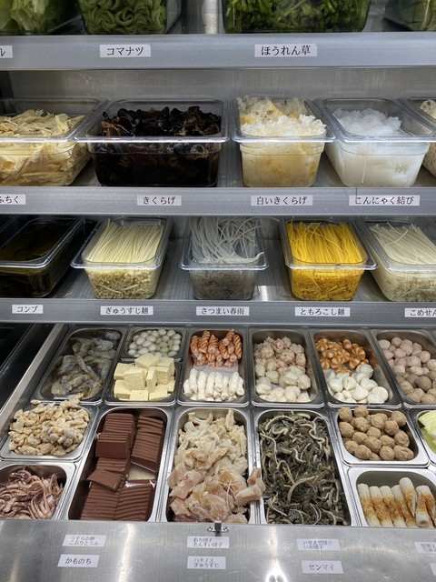 冷蔵ケースから好みの具材を選び、100g380円で量り売りされるスタイルで、野菜・肉類・豆製品・麺類などを自由に組み合わせて注文できます。