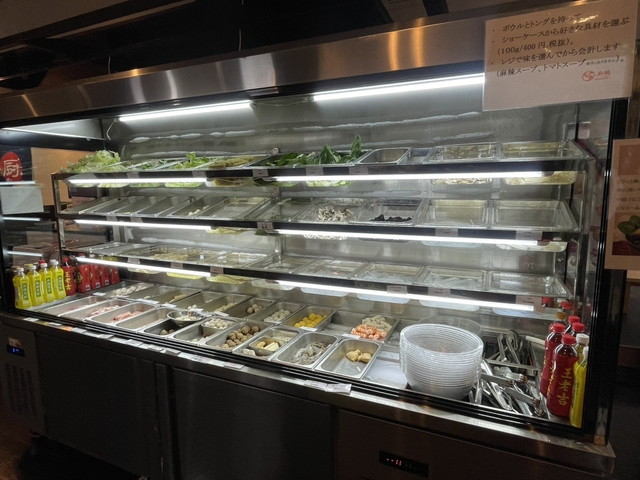 トングとボウルで好きな具材をすくい、最後にレジで重さを量って支払う「量り売り」方式を採用しており、具材の好みや予算に応じて自由にカスタマイズできるのがこの店ならではのサービスです。