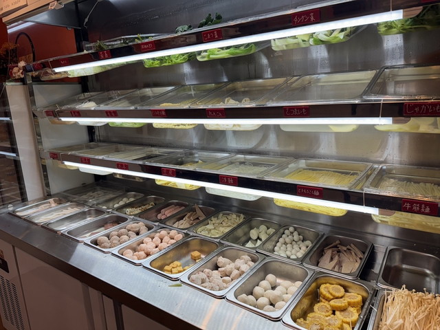 店内には約50種類近くの具材が並び、麺類から、野菜、きのこ、肉団子や湯葉風具材まで多彩。