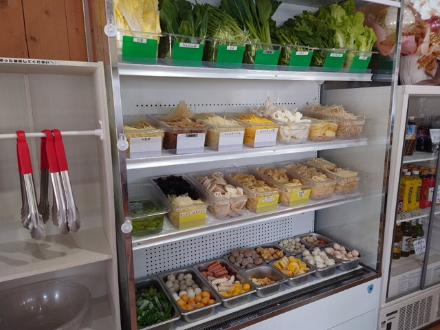 暁東麻辣湯 姫路店では、まず店舗入口付近または冷蔵ショーケースで麺・具材を自分で選ぶスタイルを採用しています。