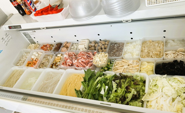 冷蔵ケースには野菜・肉・豆腐・海鮮などが並び、春雨や中華麺などの麺類も選択可能。