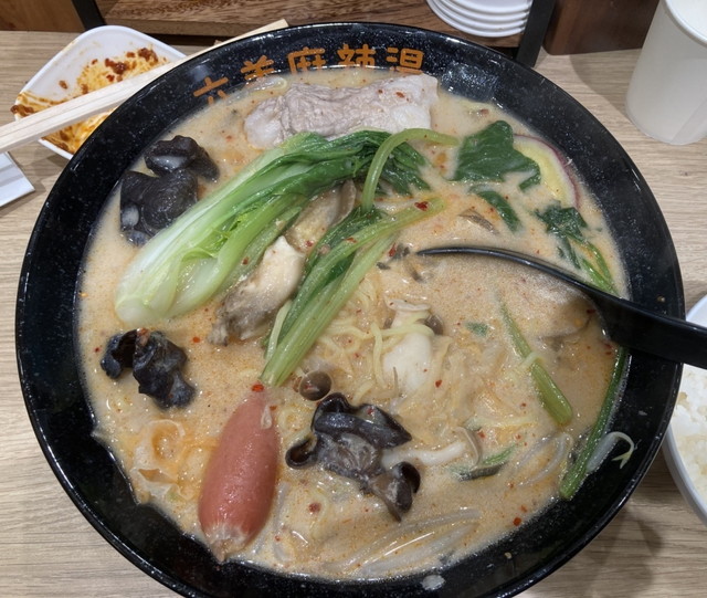 バーミヤンの麻辣湯は、鶏ガラや豚骨をじっくり煮込んだ濃厚スープをベースに、花椒(ホワジャオ)のしびれるような香りと唐辛子の辛味を加えた本格派。