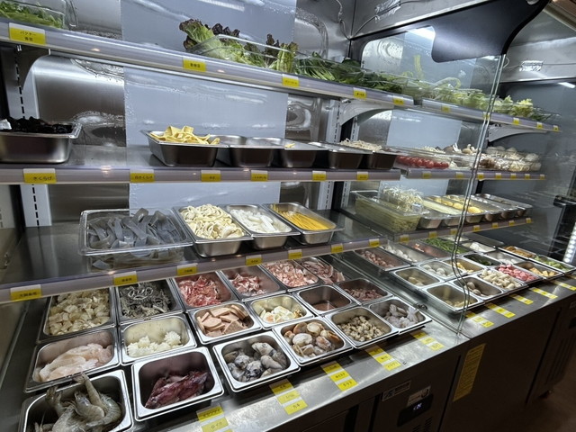 注文は量り売りのバイキングスタイルで、冷蔵ケースに並ぶ野菜・肉・海鮮・きのこなどから好みの具材を選び、100g400円で会計します。