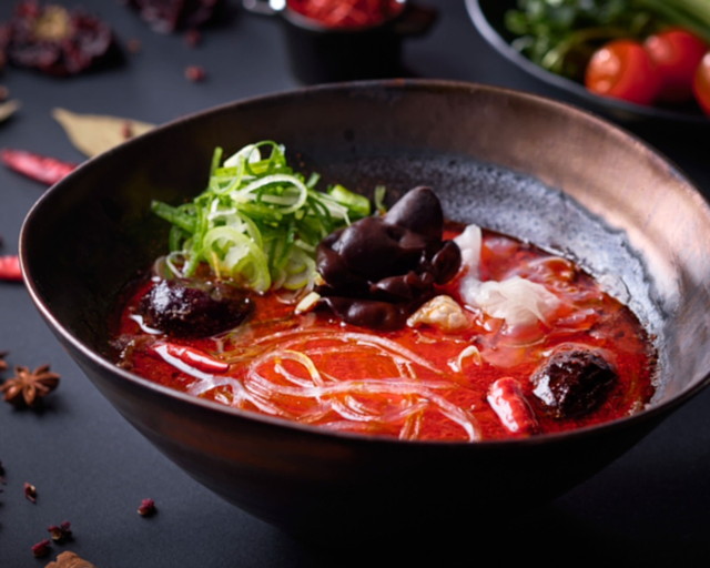 スープは花椒の痺れと唐辛子の辛味を軸にした薬膳系の味わいで、辛さは3段階から調整できます。