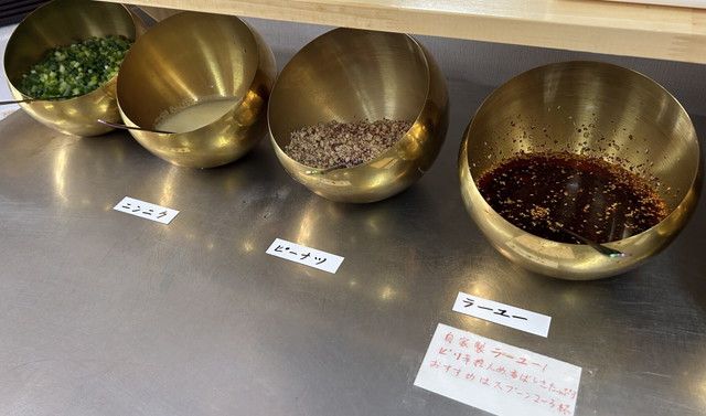 また、卓上やカウンターには、小ネギ・おろしにんにく・辣油・麻醤・香酢など各種調味料が自由に使えるよう揃っており、味の変化を自分で調整できる楽しみがあります。