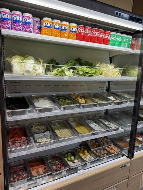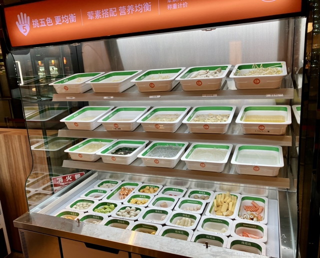 冷蔵ショーケースには、青菜・きのこ・根菜・豆製品・練り物・肉類・海鮮・団子類など、豊富な具材がずらりと並びます。