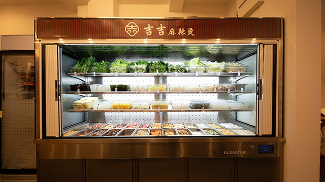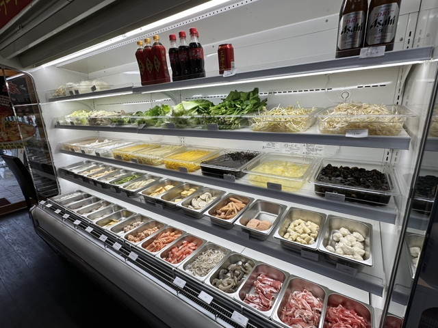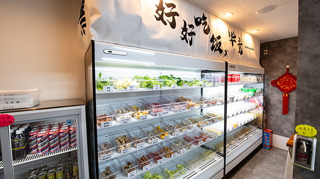 冷蔵ケースから野菜や肉、春雨などを選び、重さで会計する明快なシステムを採用。