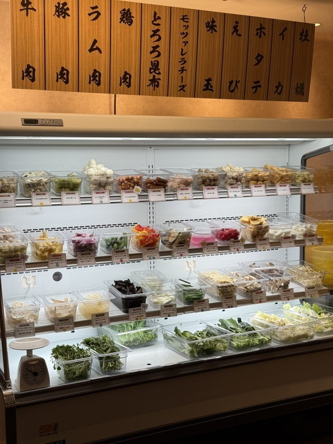 店内の冷蔵ケースには、野菜・きのこ・肉・魚介・練り物・麺類など60種類ほどの具材が並び、好きな具材を量り売り形式で選んでオーダーします。