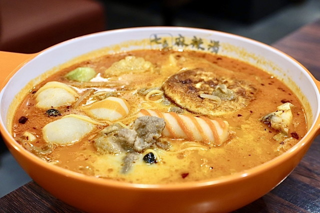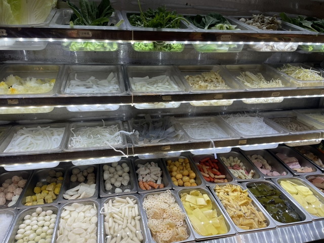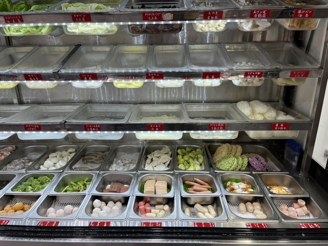 具材は牛肉・豚肉・魚団子・野菜・キノコ・麺類などバリエーション豊かで、ショーケースから重量で選び、希望のダシと辛さで仕上げる形式となっています。
