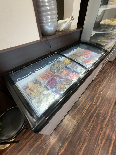 基本は量り売りのバイキング形式(100gあたり380円)で、店内の冷蔵ケースから野菜・きのこ・肉・練り物・麺類など好みの具材を自由に選びます。
