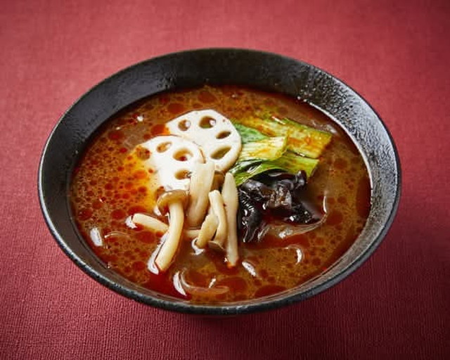 スープは10種類以上のスパイスを配合した自家製麻辣醤と牛骨スープを合わせたコクのある味わいで、花椒のしびれと唐辛子の辛味が調和した仕上がり。