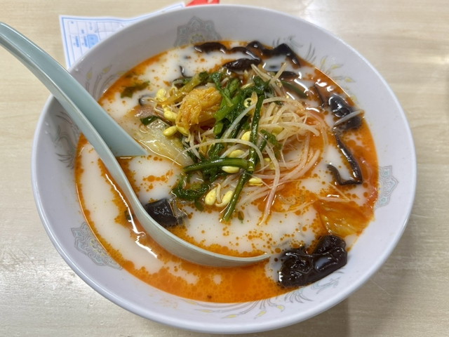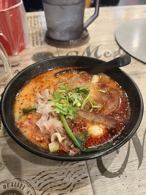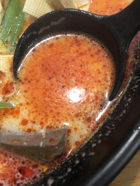 スープは豚骨と鶏骨を煮込んだ白湯ベースに、唐辛子と山椒を加えた麻辣仕立て。