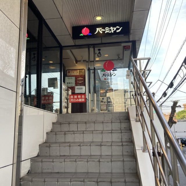 商店街の階段を上がった場所にあり、赤い看板が目印。