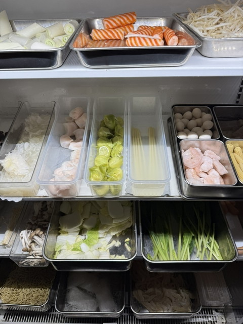 オーダーは“量り売りスタイル”で、好きな具材(野菜・肉類・練り物・豆腐・麺類など)をトングで選び、グラム単位で会計するシステム。