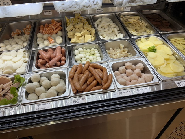 具材は冷蔵ケースに並び、野菜・肉類・豆腐・練り物・麺類など約60種類。トングで好きな具材を取り、100gあたり400円で会計されます。