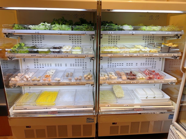 形式としては、まず冷蔵庫コーナーから野菜や海鮮、豆腐・湯葉・きくらげ・鴨血など豊富な具材を自分で選び、100g=400円という量り売り形式で好きなだけ組み合わせられます。