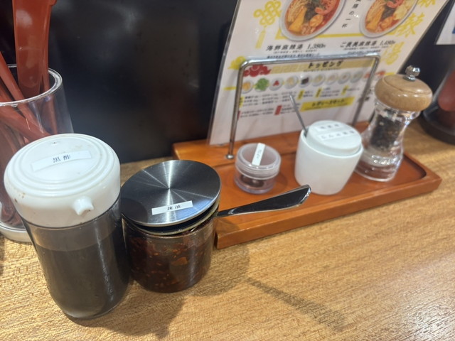卓上調味料に黒酢や辣油などが置いてあるので、こちらをかけて味変を楽しむのもありです。