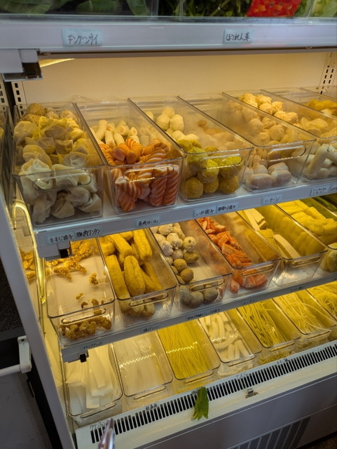店内の専用コーナーに並ぶ野菜・肉・きのこ・練り物・豆腐・魚介などから好みの食材を選び、ボウルに盛り付けて重量を計測する仕組みです。