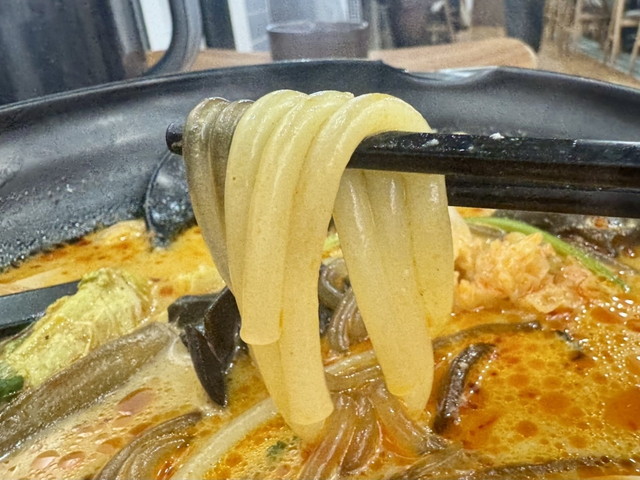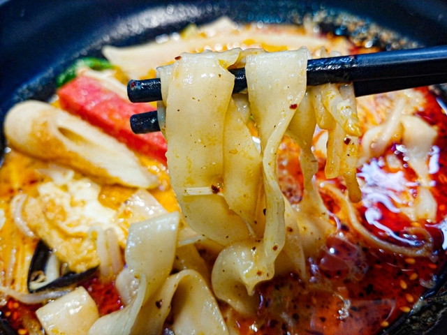 太麺(刀削麺・ホーフェン・米線)はスープを適度に吸い、辛さをまろやかにしながら旨味を引き立て、濃厚系の一杯に仕上がります。